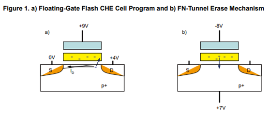 NOR Flash怎么擦写?写提高控制栅的电压,通过源极向浮置栅注入电荷,电流从浮置栅极到源极,擦就是从浮栅中挪走电荷,简不简单,直不直接?(图2)