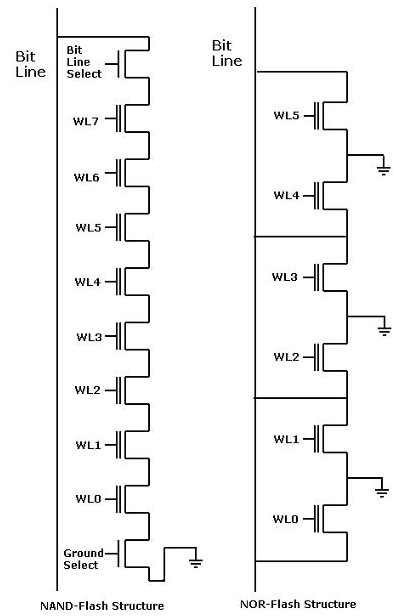 NOR Flash和NAND Flash的区别是啥呢?百度科普:NOR Flash是或非门结构,NAND Flash是与非门结构,NOR Flash密度相对低(图1)。