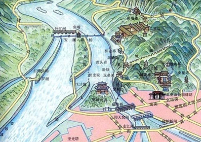 李冰开言:此乃是一个蓄水分流的策略,上游发天水,引一渠灌溉田园,水流急,乃开一大口,形如宝瓶,汛期蓄水,枯期续水,以保水流不断,若遇洪峰,借助水位,做一飞沙堰泻一闸,可保洪峰永不犯我。游方僧乃抚掌大笑,果然妙计。
