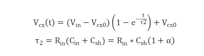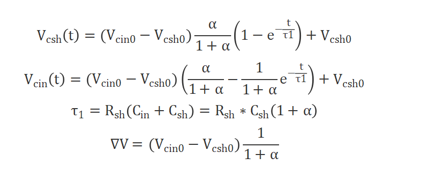 此时,等效电容为输入电容和采样电容并联,根据以上模型,可以大致推导出输入电压和采样电压对应方程如下: