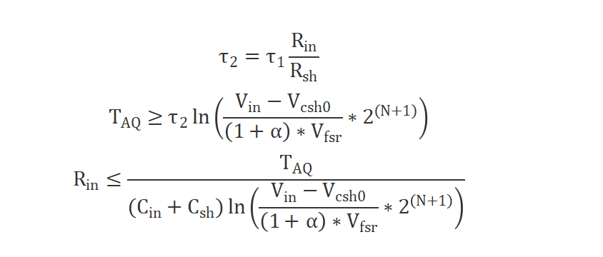 根据ADC内部结构和,我们可以很轻松的推导出,第二阶段的时间远远大于第一阶段的时间,同时,我们也可以推导出,采样时间和输入电阻必须满足: