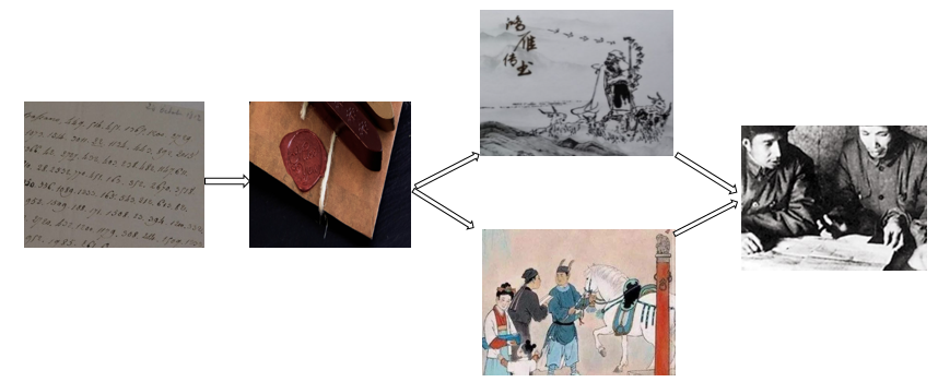以上这些都是比较简单的信息传递,略微复杂一点的信息如果需要传输的话,该怎么办呢?这里就涉及到两个问题,首先是把信息编辑成文字,我们称之为明文。有些情况下,为了防止敌人破获这些信息情报,还会专门翻译成密文。文字写好了,怎么送出去呢?一般会修建驿道,开设驿站,派遣专门的驿卒,飞马传书,部分交通不便的地方,又有人专门训练鸿雁或者飞鸽,做飞鸽传书。