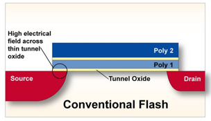 在SuperFlash闪存中,控制栅被分成两部分,只覆盖一部分浮栅,它可以直接控制流入漏极的电流。